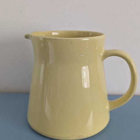 Arabia keltainen keraaminen kaadin, jossa on nokka ja kahva. Kaadin on valmistettu keraamisesta materiaalista ja soveltuu nesteiden tarjoiluun. Tuotteessa näkyy käytön jälkiä, kuten pieniä naarmuja ja värimuutoksia. Valmistettu Suomessa.