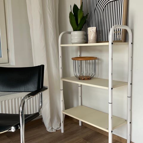 Design shopista hankitut hyllyköt, jotka muunneltavissa oman tarpeen mukaan. Runko valkoista puuta ja siirreltävät hyllyt metallia.