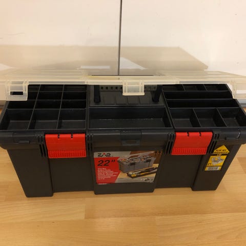 Työkalupakki renkailla ja kuljetuskahvalla. Mitat leveys 57 cm, syvyys 28 cm, korkeus 44 cm. Nouto.