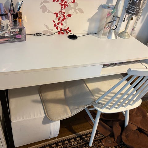 Siisti valkoinen kirjoituspöytä ja tuoli.