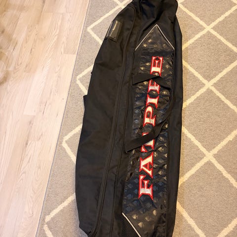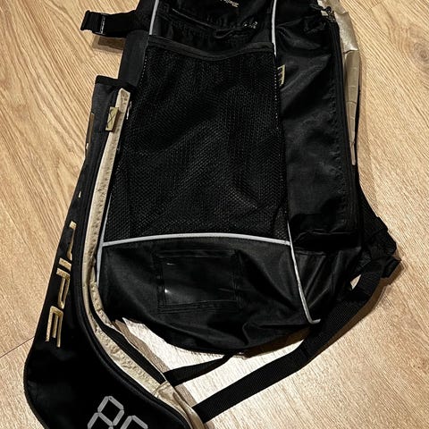 Ollut käytössä vain pelireissuilla eli siis ihan hyvässä kunnossa. Mailoille ja vaatteille/muille tavaroille omat lokerot. Ulkopuolella yksi vetoketjullinen tasku. Toisessa lokerossa kaksi vetoketjullista taskua. Myös kengille oma pussi. Bägiä voi kuljettaa myös selässä.