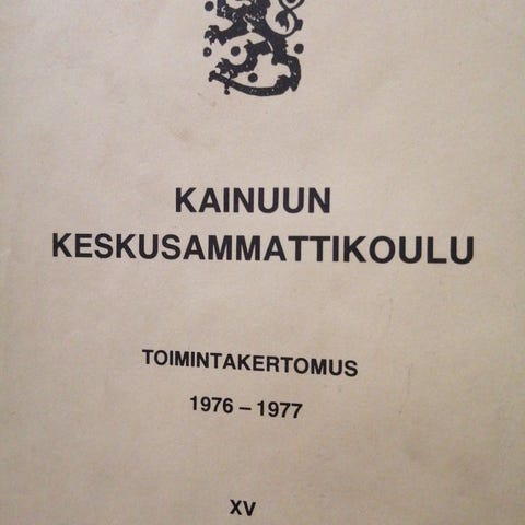 Kainuun Keskusammattikoulu Toimintakertomus vuodelta 1977-1978. Julkaisu sisältää tietoa oppilaitoksen toiminnasta, johtokunnasta, oppilaitoshenkilökunnasta, opetushenkilökunnasta sekä tilastoja ja muita koulun toimintaan liittyviä tietoja Lisäksi oppilasluettelo. Säilytetty kellarivarastossa monta kymmentä vuotta joten tuoksuu tunkkaiselle, huomioi tämä asia!! Niitit ruostuneet ja muutakin jälkeä. Kannessa piirustus.Takakannesta puuttuu pala ja lisäksi tahraa takakannessa..Jos luokkakaverin nimi ,syntymävuosi ja kotikunta hakusessa tästä löytyy ne tiedot.