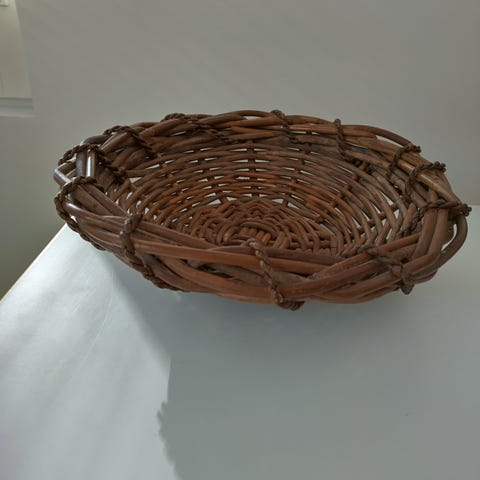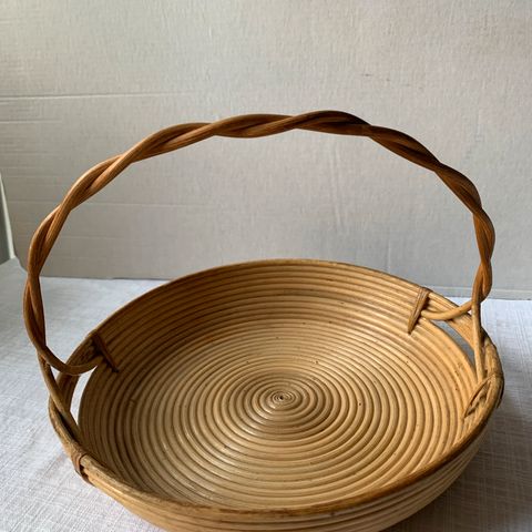 Kuvan rottinkinen tarjoilu kulhon kori. Halkaisija alhaalta 21cm ylhäältä 26cm kork. 8cm.Ehjä Lohjalla