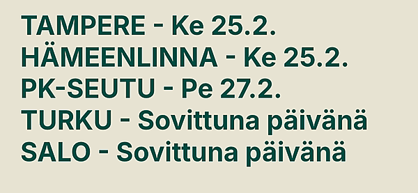 Hyödynnä ilmainen toimitus Turkuun, Helsinkiin, Tampereelle tai Hämeenlinnaan. Toimituspäivät julkaistu etusivulla.