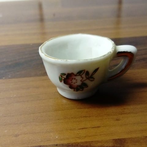 Söpöt pienet kahvikupit leikkeihin. Kupin korkeus noin 5 cm. Yhden kupin reunasta lähtenyt pieni pala - muuten moitteeton kunto.