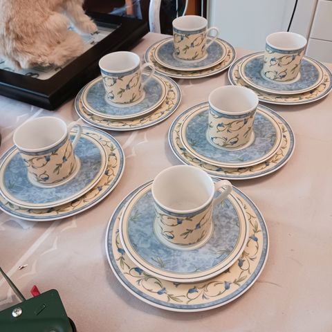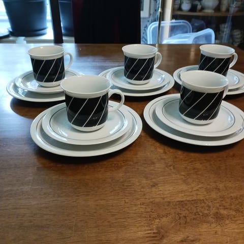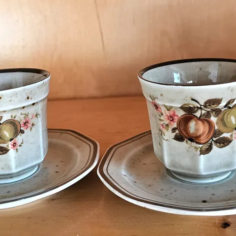 Hyväkuntoinen kahviastiasto, 6 kuppiparia. Ei kolhuja tai lohkeamia. Kuppiparin korkeus 5 cm, lautasen halkaisija n. 12 cm.