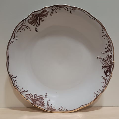 Hakusanat: posliinilautanen, kukkakuvio, kultakoriste, kahvikuppialunen, retro, vintage, keräily, kattaukset, koristeastiasto
