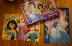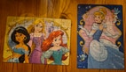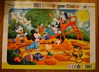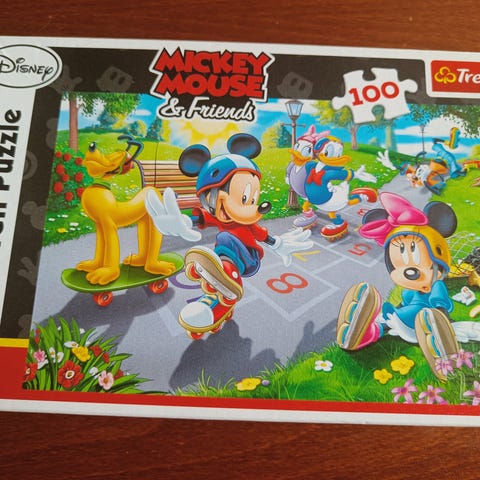Neljä Disney-aiheista palapeliä sekä Domino-peli. Dominon korteissa paikoitellen kulumaa.