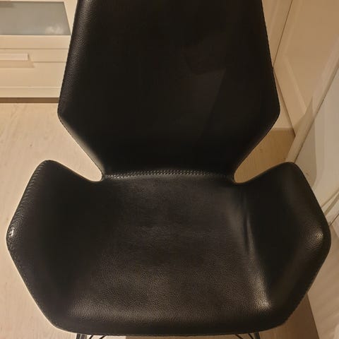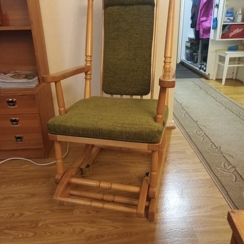 Musta mukava keinuuoli. Istuimen korkeus n. 50-55cm, istuimen leveys n. 43-45cm, istuimen syvyys n. 45-50cm.