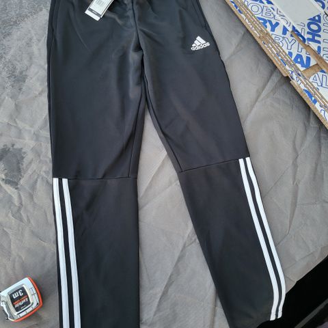 Adidas verkkarit, koko 164. Väri sininen. Housuissa on valkoiset raidat sivuilla ja nilkoissa vetoketjut.