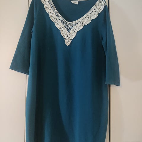 Väri on petrooli, eli sellaista sinisen vihreä. Mekossa on pitkät hihat, joissa kiva napakkuus ja ne voi hyvin nostaa ylemmäs. Taskutkin löytyy. Malli levenee alaosaa kohden. Kainalo -kainalo mitta on 52 cm, kangas joustaa ja rintojen kohdalla olevat muotolaskokset antavat lisää tilaa. Olka helma mitta on noin 100 cm. Lantion kohdalta leveys 59 cm.