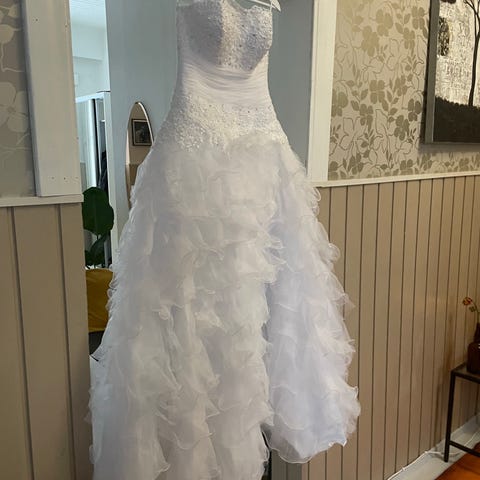 Myydään kerran päällä ollut häämekko. Häämekko on pesty ja silitetty, joten heti käyttövalmis. Soveltuu myös muihinkin juhliin. Kokoa hieman pienennetty ompelijalla istuvammaksi. Koko siis noin 42