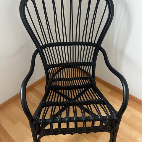 Vähällä käytöllä sisätiloissa ollut hyväkuntoinen musta Ikea rottinkituoli. Lisäksi mahdollista ostaa ruudullinen puuvillakankainen istuintyyny +65€ (ovh 90€). Ei tinkimistä ja vain nouto.