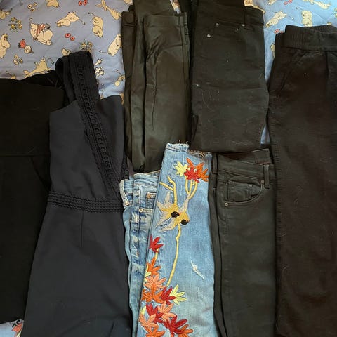 Sisters Point mustavalkoraidallinen pitkä t-paita koko S. H&M 36 musta vetoketjullinen fleecetakki. H&M koko S harmaa neulepaita. More & More 36 kokoinen vihertävä kukallinen juhlapaita.