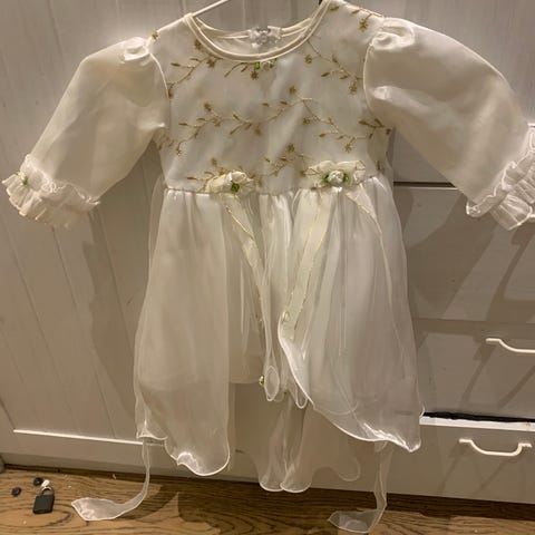 Vauvan juhlamekko. Siisti käytetty kunto. Koko 74, ehjä ja tahraton. Samettimainen, alushameessa tylli, säilytyksestä rypyssä. Vetskari takana.
