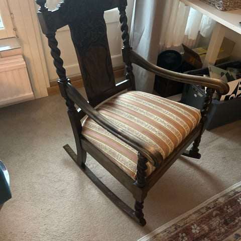 Myydään vanha keinutuoli. Keinutuolissa on käytössä tullutta kulumaa maalipinnassa, ja näistä kulumista on esimerkkikuvia. Selkänojassa on kaksi lautaa vähän liikahtanut paikaltaan, mutta ne eivät haittaa käyttöä (katso kuva 2). Kulumat ja muut vastaavat on huomioitu hinnassa.