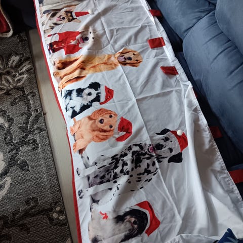 Kaunis hienosti laskeutuva kevyt jouluverho. Ala osassa kuvaa yläosa sininen leveys 140cm pituus 220cm näitä 2kpl