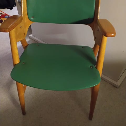 Vanhat iskun koulutuolit 4kpl. Tukevat ja kestäneet hyvin aikaa. Istuinkorkeus 40cm, selkänojan korkeus 68cm.