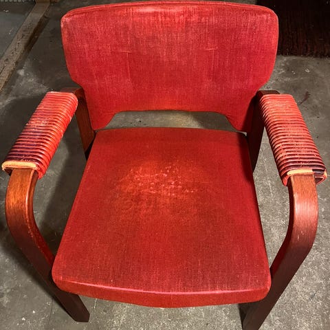 Helsingin kaupungintalon sisätilat uudistettiin 1960-luvulla radikaalisti arkkitehti Aarno Ruusuvuoren suunnitelmien mukaan. Tämä käsinojallinen tuoli on alunperin suunniteltu kaupungintalon juhlasaliin. Suunnittelijana Pentti Heinonen.