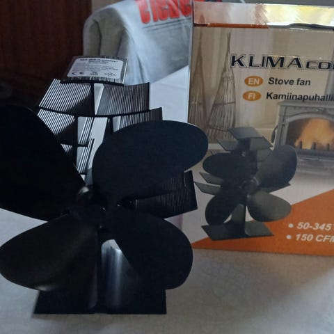 Uusi käyttämätön kaminapuhallin kaupan paketissa