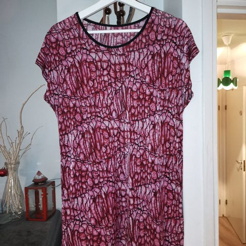 Naisten tummanharmaa-valkoraidallinen Italiassa valmistettu tunika, ei tuotemerkkiä, miellyttävää polyesteri-viskoosi-elastaania. Mitat: kainalosta kainaloon 49 cm, pituus hartiasta helmaan 80 cm, hartia-hihansuu 38 cm. 3/4-pituisissa hihansuissa sievä rypytys.