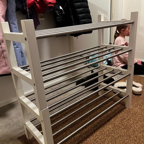 Siisti ja ehjä hopeanvärinen kenkähylly. Kunnossa ei moitteita.