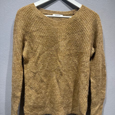 Huippukuntoinen, muutaman kerran käytetty neulepusero, jossa näyttävä kaulus. Väri kauniin syksyinen - ruskeaan taittava oranssi. Mitoitus reilu, oversize. 30% alpakkaa.