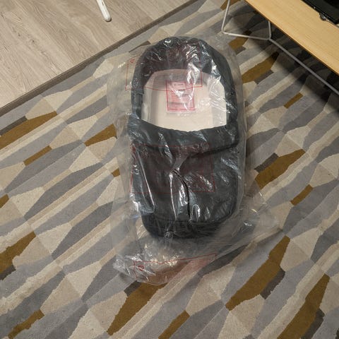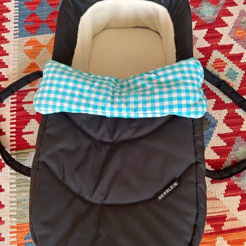 Bumbleride lastenvaunujen kantokoppa harmaalla ulkopuolella ja punaisella sisäosalla. Kantokopassa on kantokahvat ja se on suunniteltu käytettäväksi lastenvaunujen lisävarusteena. Materiaali on kestävä ja sopii lapsen mukavaan ja turvalliseen kuljetukseen.