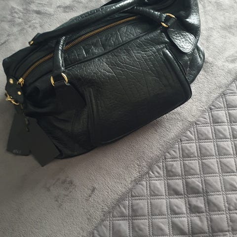 Musta unisex laukku, satunnaisesti käytetty, musta vuori, taskuja. Mitat pituus 47 cm, korkeus 34 cm, leveys 20 cm.