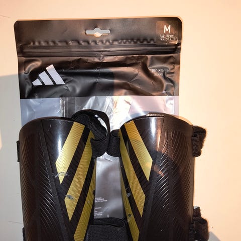 Moitteettomassa kunnossa olevat Adidas Tiro säärisuojat. Kokolaput on leikattu pois, mutta suojan pituus on 13,5 cm. Meillä käytetty alle 9-vuotiaalla.