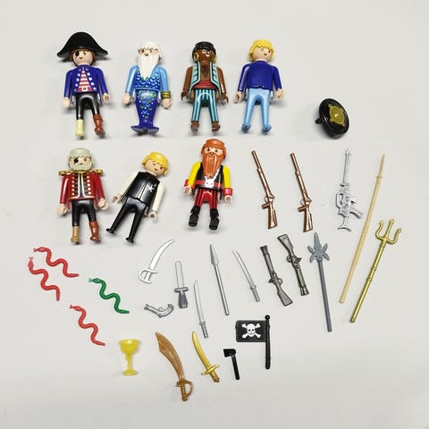 Vanhoja Playmobil nukkeja vuosilta 1974, 1990 ja 1992. Ikäisikseen tosi hyväkuntoisia, paitsi reunimmainen valkoinen ukkeli on kellastunut varsinkin takaa ja toiselta ukkelilta puuttuu hiukset.