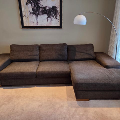 Vuodesohva, divaani, rahi ja sivupöytä. Kaikki verhoiltu samalla kankaalla, joka on helppohoitoista ja lika lähtee pyyhkimällä. Tarvittaessa saa myös irroitettua osat tyynyistä ja pestyä. Puuosat (sivupöytä ja jalat) ovat tummaa pähkinäpuun väristä.