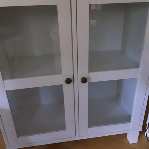 Tamminen vitriinikaappi. Kaksi lasiovea, jossa kaksi lasihyllyä + alahylly tammea. Yksi leveä vetolaatikko, joka jaettu sisältä kahteen osaan sekä 2-ovinen kaappi, jossa yksi puuhylly + pohjahylly. Hyväkuntoinen. Iskun mallistosta ostettu.