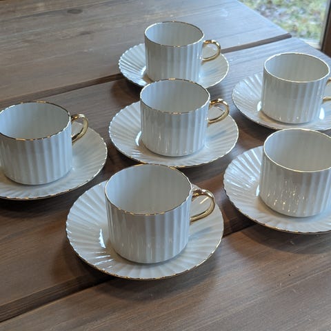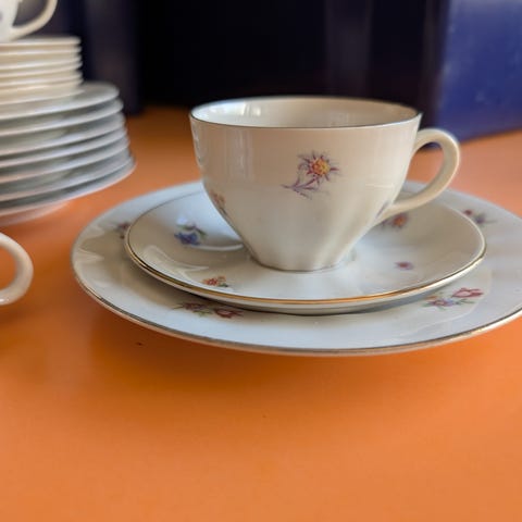 Arabia 1872 Kahvikuppi ja lautanen 5 kpl valkoinen kultareunus