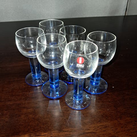 Iittalan/Nuutajärven Mondo-sarjan snapsilasit, 6kpl sekä iso viinilasi. Snapsilasin korkeus 8,4 cm, viinilasin korkeus 19,7 cm ja suuaukon halkaisija 9,5 cm. Kunto hyvä, viinilasissa tarra jäljellä. Nouto tai lähetys.