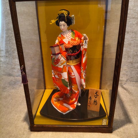 Kaunis japanilainen kokeshi-nukkepari, ostettu Tokiosta vuonna 2012. Nuket on tehty puusta ja maalattu käsin perinteiseen tyyliin: koristeltu sinivihreän ja persikanvärisillä kimonoilla. Mukana tulee alkuperäinen puinen valmistajan laatta, jossa on valmistajan nimi ja leimat.