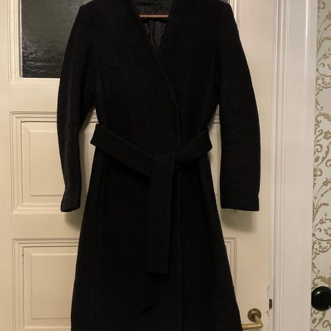 Kuin uusi naisten kaunis ja tyylikäs villakangastakki. Ihanan lämmin. Vetoketju ja piilonepparit. Matala pystykaulus, vyötäröllä solmittava vyö. Edessä pystysaumoissa taskut. Koossa 34 pituus n.102 cm. Kainalo-kainalo 50cm. Materiaali: 75% villaa, 25% polyamidia. Vuori 100% viskoosia.