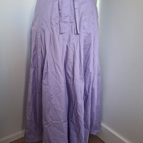 Violetti hame, jossa edessä sidottava nauha. Materiaali 90% viskoosi ja 10% polyesteri. Pituus 78cm ja vyötärö 33cm.