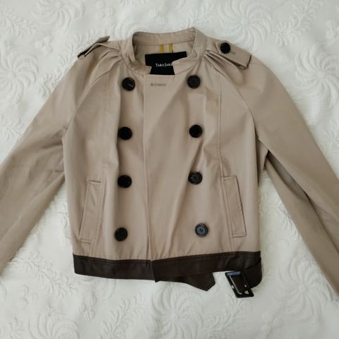 Tara Jarmonin luonnonvalkoinen / kerman värinen takki, sopii kevääseen ja syksyyn. Kultaiset napit ja ruudullinen vuori. Koko 38. Kauluksessa ja olalla pientä värjäytymää mutta ei ole koitettu pestä pois, lähtenee kuitenkin esim. Sappisaippualla tms. Ei juuri näy käytössä.