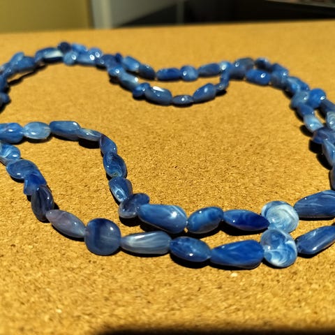 Pitkä kaulakoru, jossa hopean väriset muovihelmet sekä 3 metallin väristä ketjua. Voi pitää eri tavoin, esim. tehdä ketjuun solmun.