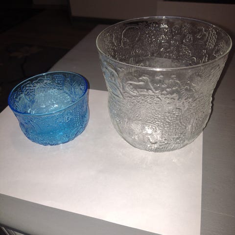 Myydään kuvan lasinen astia suoraan kaapin päältä.
