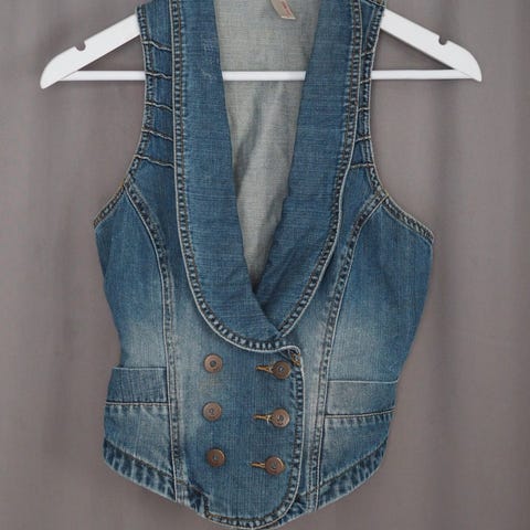 Sininen farkkuliivi, vastaa kokoa S (ei kokolappua, kainalo-kainalo 44 cm venyttämättä). Kaula-aukko muokattu (kaulukset poistettu). Joustava, ohuehko kangas, menee vaikka toppina. Vähän käytetty ja hyväkuntoinen.