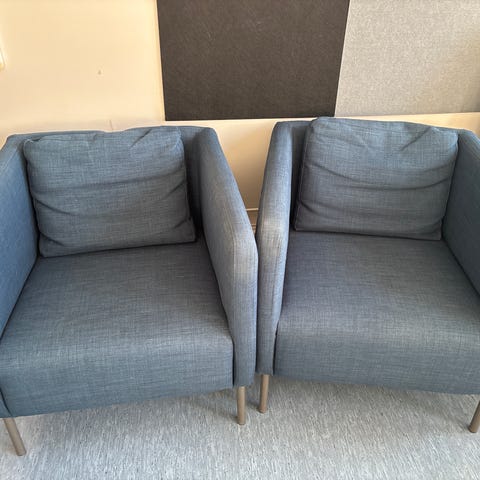 Kaksi H&M home lounge tuolia. Toisessa reikä. Lienee korjattavissa. Saa myös nätisti piiloon viltillä, ei haittaa istumista. Ovh. 279e/tuoli. Molemmat yhteensä 180e.