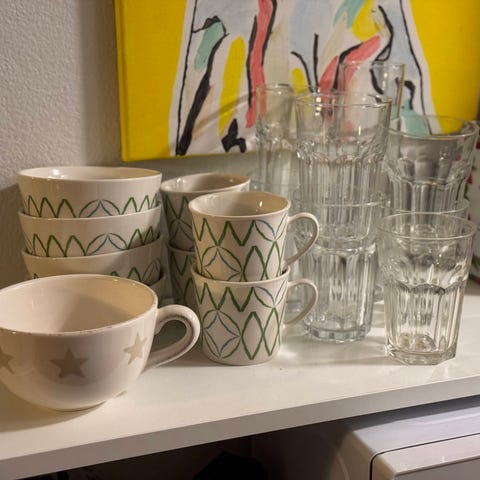 Muutamassa pientä halkeamia ja kaikissa kulutuksen naarmuja, mutta ajavat hyvin asiansa esteettisistä vioista huolimatta. Kollailen muuttotavaraoita, niin mukaan tulee varmasti jotain lasia ja ruokailuvälineitä ym.