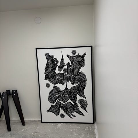 Seinälle tarkoitettu taulu, jossa on useita värikkäitä kuppikuvia ja teksti 'ANOTHER?'. Kehyksellinen ja graafinen design, joka sopii sisustukseen.