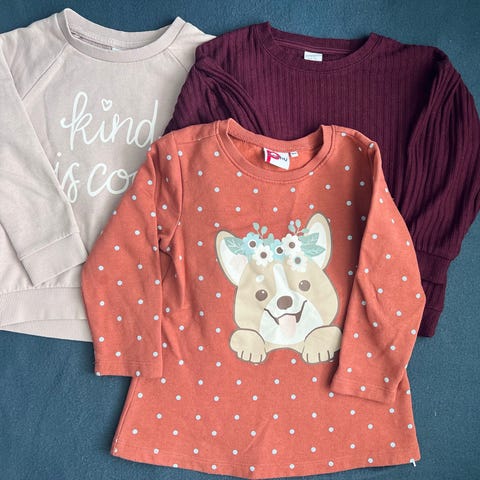 Vaatepaketti tytöille (housut, collegepaita ja mekko), koko 104