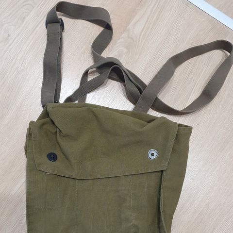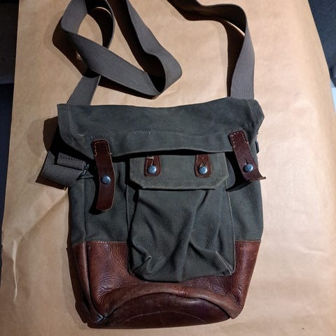 Armeijan karttalaukku, muovikalvo osittain rikki sekä komoassitaskun vieressä oleva ohut nahkaremmi leikattu pois. Olkahihna ei alkuperäinen ja sen max pituus 140. Sitä voi lyhentää soljella.