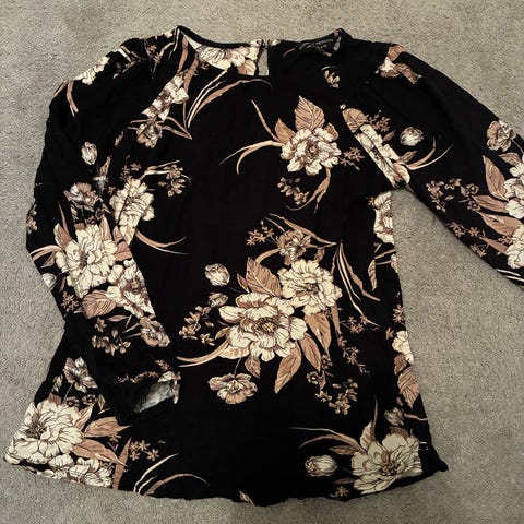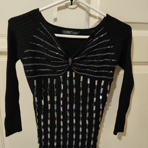Musta pusero valkoisilla lisäyksillä. Musta kangas neuletta ja hieman venyvää. Hihat, kaulus ja helma valkoisia. Hihoissa kauniit kukkaneulokset. Amy Vermot desing. Koko 38. ka/ka 50 cm pituus 74cm