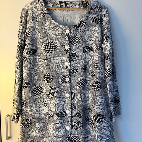 Kerran päällä ollut hyvin joustavaa materiaalia. Mitat; kainalo-kainalo 57cm lantionleveys 70cm niskahelma 102cm hihanpituus 65cm. Kuminauha poistettu helmasta. Pieni reikä korjattu ja huomioitu hinnassa.Materiaali 95% puuvillaa 5% elastaani.Edessä isot taskut ja vetoketju. Hinnasta en tingi.