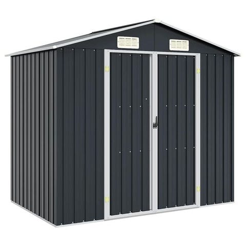 Tämä varastorakennus on varustettu tuuletusaukoilla, jotka tarjoavat ilmanvaihtoa, joka vähentää kosteuden ja hajujen muodostumista vajaan. Hyllyillään se tarjoaa reilusti säilytystilaa tärkeiden tavaroidesi järjestyksessä pitämiseen. Tämä vain vähäistä huoltoa tarvitseva erittäin kestävä ulkovarasto on valmistettu galvanoidusta teräksestä. Vajan kaksi ovea edessä helpottavat sisään- ja uloskäyntiä. Kaltevan kattorakenteen ansiosta sadevesi valuu katolta pois itsekseen.
